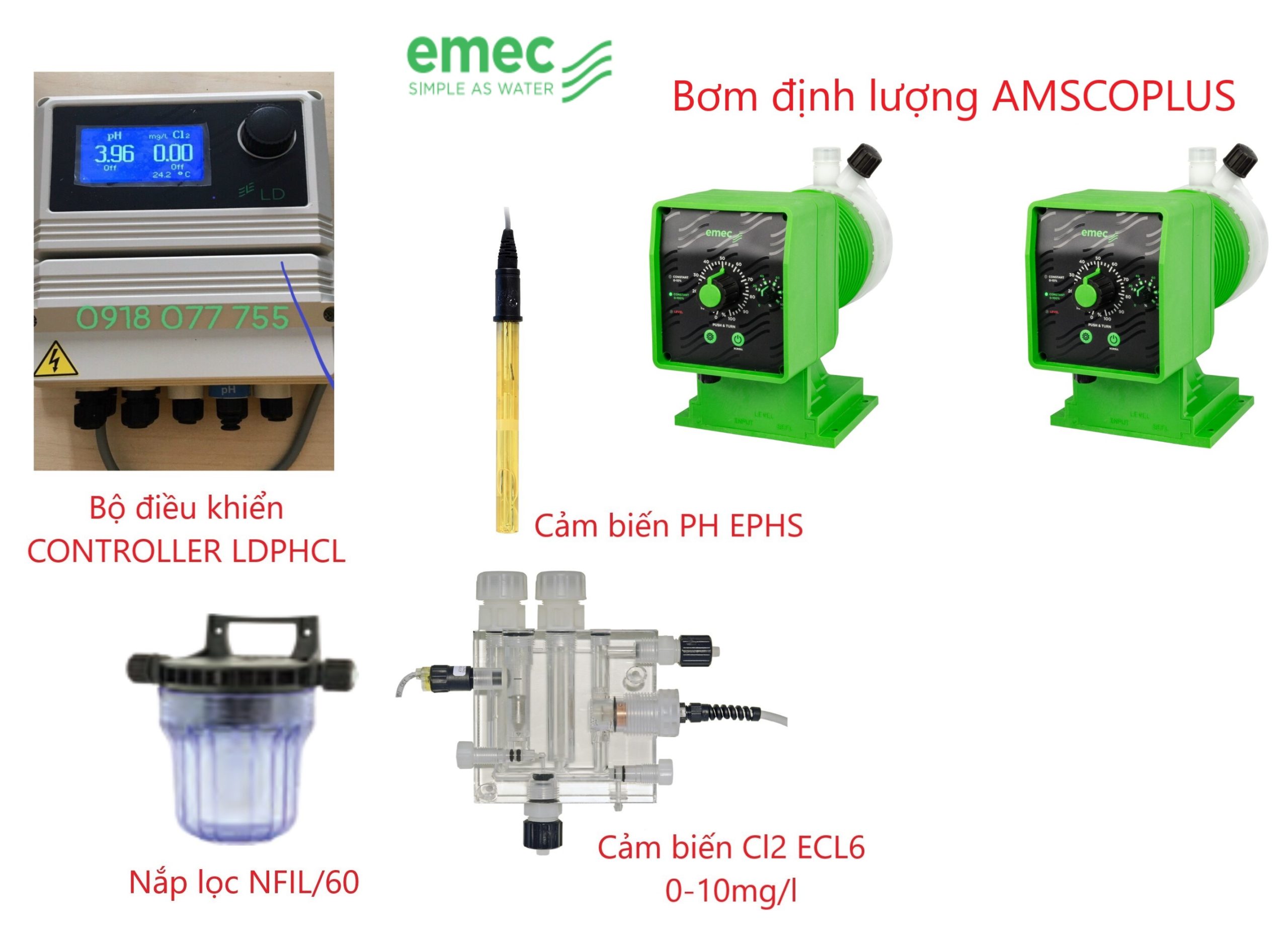Nhà phân phối Bơm định lượng Emec- Thiết bị châm hóa chất Clo-ph tự động Emec_LDPHCL độc quyền